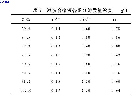 一般用8個床體積的100g/L的NaOH溶液,淋洗可告完成。Na2CrO4絕大部分集中在前4個床體積的淋洗液中,后4個床體積的淋洗液中ρ(CrO3)較低,在工業(yè)生產(chǎn)中,將其視為貧液作為下次淋洗時的貧淋洗劑。正常的淋洗操作,首先采用貧淋洗劑自上而下流過樹脂層,當(dāng)流出的淋洗液呈橙紅色或pH為7時,將其收集于合格液儲槽;當(dāng)流出的淋洗液由橙紅色變?yōu)槌赛S色或pH>9時,將其收集于貧液儲槽,這時淋洗劑改為100g/LNaOH溶液,體積約為合格液的體積。淋洗合格液組分的質(zhì)量濃度列于表2。