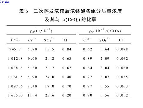 經(jīng)二次蒸發(fā)濃縮的濃鉻酸各組分質(zhì)量濃度及其與ρ(CrO3)的比率列于表5。