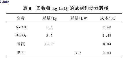在調(diào)試的第1個月,回收獲得CrO3270kg,其試劑和動力消耗列于表6。