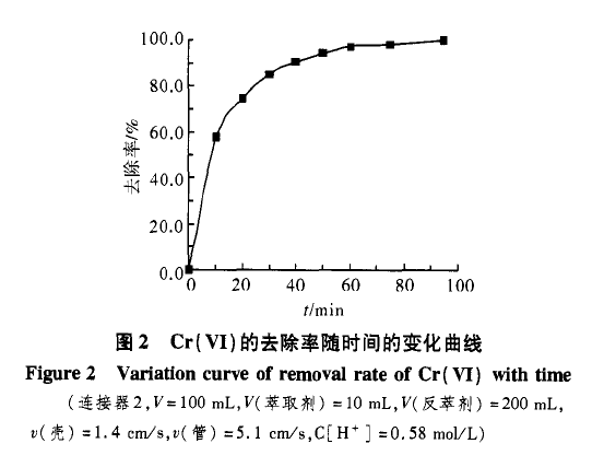 廢水中Cr(VI)的去除率隨時間變化關系如圖2所示。初始階段,去除率迅速升高,處理過程進行到40 min時,去除率達90% 以上;至75 min時,Cr(VI)濃度從87.2 mg/L降至1.6 mg/L,去除率達到98.2% 。又經過20 rain,Cr(VI)濃度達0.1 mg/L,去除率高達99.8% 。HFRLM技術中,中空纖維膜內壁面上的液膜在連續相剪切力作用下不斷更新,具有強化傳質的作用,而且采用中空纖維膜接觸器可以提供較大的傳質比表面積。張衛東等采用中空纖維更新液膜技術處理含銅廢水時,體積傳質系數比傳統萃取塔大530多倍 。由圖2所示的結果可以看出,使用HFRLM技術處理含鉻廢水也具有快速、高效的特點。