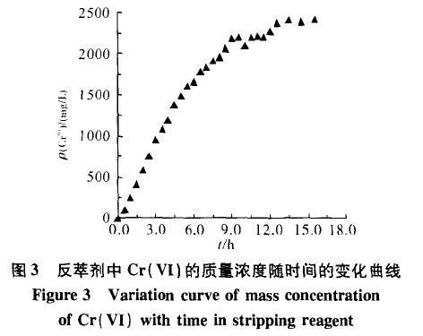實驗結束時,反萃劑中Cr(VI)濃度比液膜另一側廢水中cr(VI)濃度高出3~4個數量級,而液膜兩側料液相和反萃相的體積幾乎沒有變化。該結果不僅證實了HFRLM技術其非平衡傳質的特點,溶質可以實現“逆濃度梯度”遷移,實現Cr(VI)的濃縮,同時也表明反萃劑不會穿過液膜泄漏至廢水中,進一步表明HFRLM技術具有較好的穩定性,其所形成的液膜層能有效地分割兩側流體,傳質過程中無泄漏發生。