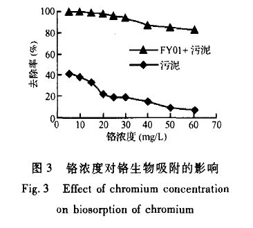 吸附劑與污泥的協同促進作用,主要是由于活性污泥可以為生物吸附劑提供一個穩定的緩沖環境,同時污泥中的微生物也具有一定的解毒能力 ;在該緩沖環境中,生物吸附劑對鉻的高效還原解毒能力是鉻生物去除的關鍵。還原后,高毒性的cr”被轉化為低毒性的Cr” ,有效地降低了鉻對污泥及FY01的毒性破壞,污泥仍能以菌膠團存在 。