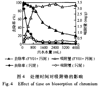 圖5是2種吸附材料處理不同進水流速的電鍍廢水2 h后的實驗結果。處理的水量隨進水流速的增加而增大,當流速達500 mL/h,處理水量達1000 mL后,10 g FY01和5 g污泥的除鉻效率下降速度增快。而在低進水流速時,15 g污泥的除鉻效率降低速度較快。這與}引尼對鉻的吸附容量小、還原解毒能力不足等因素有關 。