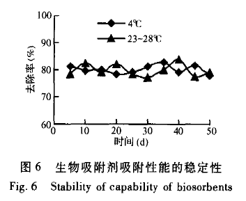 吸附性能的穩定性直接影響生物吸附劑的研究價值和實際應用價值。本實驗分別對在4℃ 冰箱和23~28℃實驗室保存不同時問的FY01進行了吸附實驗,如圖6所示。結果表明,FY01具有較理想的吸附穩定性,50 d內連續10次吸附實驗,對60.4 ms/L鉻的去除率的極差值分別在5%和7% 內。因此,可以判斷FYO1的微生物群落構成處于動態平衡狀態。