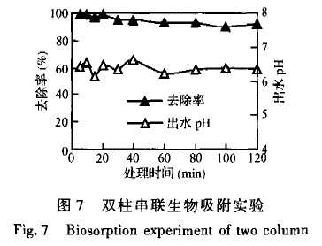 利用裝有10 g FYO1和5 g污泥的吸附柱串聯處理1000 mL/h電鍍廢水2 h的結果如圖7。串聯生物曝氣工藝對含鉻廢水的處理效果理想,對鉻的去除均達90%以上,比單柱的效率高10% ;出水pH在6.15 —6.61之間。在該處理過程中,第2吸附柱進水是第1柱的出水,總鉻濃度已降至原水的60%左右,六價鉻已被有效地還原為低毒性的三價鉻 。有利于第2吸附柱中的生物吸附材料對鉻的體內積累,促進鉻的生物去除。串聯法也減少了廢水短流對處理效果產生的影響。