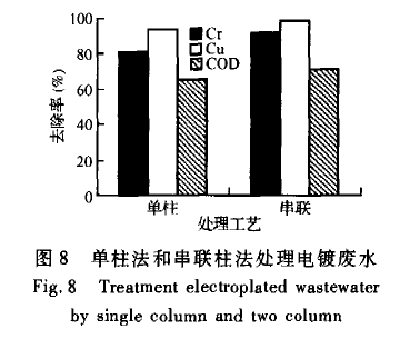 本實驗分別采用了單柱吸附法和串聯柱吸附法處理電鍍廢水,每根柱裝10 g FY01和5 g活性污泥,單柱處理廢水1000 mL,雙柱處理2000 mL,處理時間均為2 h。圖8結果表明,串聯法處理該電鍍廢水是非常有效的,對廢水中60.4 Illg/L總Cr、4.51 mg/L Cu“和48.2 mg/L COD的去除率分別高達92.1% 、99.2% 和71.4% 。