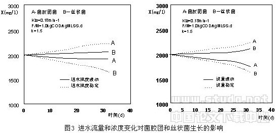實際的污水處理廠負(fù)荷是變化的,實驗發(fā)現(xiàn)在停留時間3、4和5h.下,系統(tǒng)的溶解氧濃度分別為1.2,2.2和3.0mg/l。圖3是流量和基質(zhì)增加幅度為1.5倍采用計算機模擬結(jié)果。在穩(wěn)定的流量和濃度條件下,長期運行是菌膠團(tuán)細(xì)菌占優(yōu)勢。流量或是基質(zhì)濃度的變化會造成絲狀菌的過度生長,而絲狀菌的生長不是一簡單的可逆過程,結(jié)果會造成了污泥沉降性能的變化。值得說明的是上述結(jié)果是在相對高的負(fù)荷下的模擬結(jié)果,研究表明對低負(fù)荷結(jié)果相反。