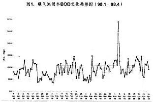 從圖1看到,曝氣池進(jìn)水BOD5 在98年1月份普遍偏低,基本上處于100mg/l以下,特別是從下旬開(kāi)始,處于明顯的下降趨勢(shì),最低曾達(dá)40mg/l。