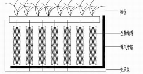 植物修修復過程中,實際靠植物直接吸收去除的污染物質還不到實際去除率的一半,這其中植物與微生物的聯合作用有非常大的貢獻,植物可能從增加根際氧濃度,分泌微生物營養物質或者活性物質以及為微生物提供載體等方面影響微生物的密度和分布。利用生物膜——生態復合強化處理技術處理重污染河段,可以通過人工強化復氧和植物分泌和外加附著載體多方面刺激微生物的生長,提高微生物的處理效應,同時載體的吸附和植物的吸收三重去除可大大提高系統對水中污染物的去除效率。處理采用好氧,缺氧兩級處理,以達到更佳的處理效果。