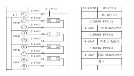 模擬量輸入:一站集水池液位,二站集水池液位,清水池液位,污泥池液位,過(guò)渡水池液位,溶藥箱液位,流量計(jì)和四個(gè)進(jìn)化器的濁度和壓差。