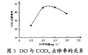 由圖可知,SBR溶解氧平均控制在1.0~1.5mg/L左右時,COD。 的去除率較高,經過3h反應出水為560mg/L,反應器中45% 的有機物得到了去除,反應中未檢測出NO-,較高的有機含量和低溶解氧抑制了硝化反應的發生。DO>2mg/L,容易發生硝化反應,COD 去除率降低,說明再增加溶解氧在較短的時間內并不能有效地提高去除率,而且以完全好氧方式,亦增加能耗和運行費用。當DO<O.5mg/L時,由于DO不足,抑制了細菌正常的代謝活動此時微生物不甚活躍,出水混濁。