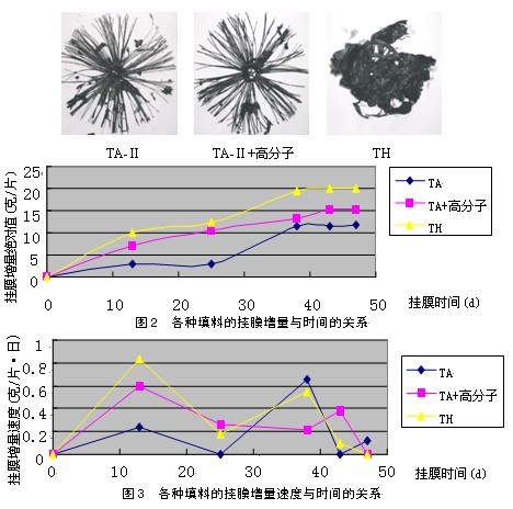 (2)從掛膜速度來看,達到與TA穩(wěn)定期(約40d)的同樣掛膜量TH只需25d,TA-Ⅱ+高分子為30d。而在開始掛膜的最初30天的速度TH為TA-Ⅱ的5倍,TA-Ⅱ+高分子為TA-Ⅱ的4倍。如將TA-Ⅱ+高分子的填料絲徑減小為0.35mm,同樣可望達到與TH相同的掛膜速度。