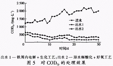 (3)廢水經鐵屑內電解處理后,BOD5/CODcr由原來的0.14增加到了0.31,大大提高了廢水的可生化性。再經生物處理后,CODcr的去除率>90%。