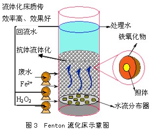Fenton氧化法是利用過氧化氫(H2O2)和亞鐵離子(Fe2+)反應,產生強氧化劑·OH,將廢水中的有機物氧化并去除的一種化學處理法[6,7]。Fenton流化床是利用流化床的方式使Fenton法所產生的三價鐵大部分結晶或沉淀,是一項結合了同相化學氧化(Fenton法)、異相化學氧化(H2O2/FeOOH)、流化結晶及FeOOH的還原溶解等功能的新技術。鐵氧化物具有異相催化的作用,而流化床的方式也提高了化學氧化反應及質傳效率,使COD及色度的去除率提升。Fenton流化床示意圖見圖3。
