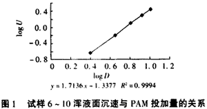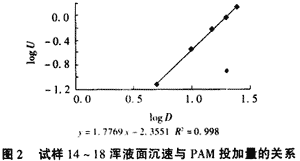 于是可以推測U0與D有相關性。而高濁度水混凝渾液面沉速不僅與含沙量有關,而且與顆粒因素有關。用UO可以部分地表征高濁度水的顆粒因素(從表1也可反映出來),從而在實際處理一定組成的高濁度水時可以借助試驗得到的經驗關系,根據渾液面自然沉速以及所期望達到的渾液面沉速來確定PAM的投藥量。
