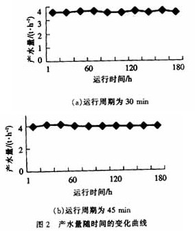 圖2分別為運(yùn)行時間為30min和45min的產(chǎn)水量隨時間的變化曲線。