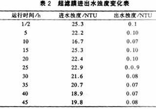 在試驗中,對于超濾膜能否作為反滲透的預(yù)處理,主要從超濾產(chǎn)水的水量和水質(zhì)來考慮。超濾的產(chǎn)水水質(zhì)必須符合反滲透膜的進(jìn)水要求,否則反滲透膜會很快被污染,大大影響膜的使用壽命。同時超濾膜產(chǎn)水量需比較穩(wěn)定,以便于整個設(shè)備的宏觀設(shè)計和運(yùn)行操作過程的控制。