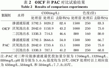 為了進一步驗證OICF處理垃圾滲濾液效果的優越性,本文將OICF和聚合氯化鋁(PAC)對三種垃圾滲濾液進行了實驗室對比試驗,試驗結果見表2。