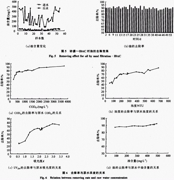 砂濾一IBAc工藝能較好地去除水中油脂及其他有機(jī)物,其對(duì)CODcr的去除率為55%~92% ,而一般的物理化學(xué)法,如混凝法,對(duì)c0Dc 的去除率僅為60% ~75%[15,16];該工藝對(duì)水樣的CODcr平均去除率為77.20% ,對(duì)水中油的平均去除率為86%,也達(dá)到了其他傳統(tǒng)生物處理方法的處理效果[1]。