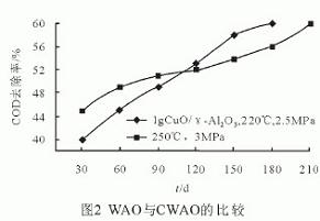 制備了質量分數為1%(以下皆同)的載Cu催化 劑,從圖2中可以看出,在110min以后,CWAO對造 紙廢水COD去除率才高于WAO,表明短時間內反應 溫度高,氧氣分壓大,無催化劑的濕式氧化也具有較 好的降解效果,但隨時間的延長,達到更高的廢水 COD去除率,則CWAO所需時間比WAO少。當 WAO變為CWAO后,更多的氧氣可以嵌入載體上的CuO晶格中,同時Cu的活性位又可以吸附氧,從而能截留住更多的氧氣。