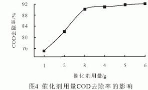 廢水體積量增大,催化劑用量就要相應增加。但從處理固定體積容量的廢水角度來說,過多使用催化劑則會造成資源浪費,增加處理成本,因此需考察催 化劑用量對廢水COD去除率的影響。