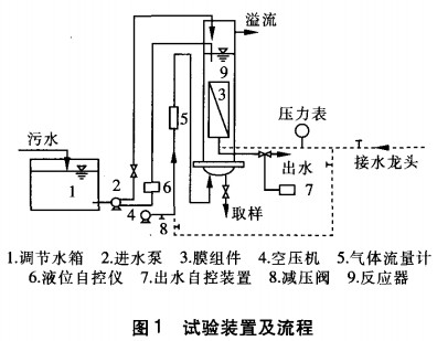 采用兩套完全相同的裝置(分別記作ln}2#)進行試驗。工藝流程見圖1反應器為有機玻璃制成,直徑為200mm,高為2m,內置孔徑為0.2um、膜面積為0.5m2的聚偏氟乙烯中空纖維膜組件。依重力間歇出水,由液位自控儀控制反應器內水位基本恒定。