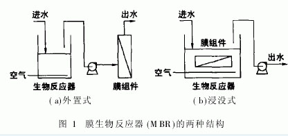 外置式膜生物反應器(RMBR)的特點是,膜組件自成體系,運行穩定可靠,膜通量較大,清洗、更換和增設方便等。其缺點是高速旋轉產生的剪切力,會使某些微生物細菌體失活,而且一般條件下,為減少污染物在膜表面的沉積,由循環提供的水流流速都較高,因此動力消耗也較大。一體式膜生物反應器(SMBR)最大的特點是,運行費用低,但其膜通量相對也較低,易發生膜污染,膜組件的拆裝、清洗通常也較困難。不過,中空纖維式膜組件由于體積較小、組裝靈活,可分組設置成若干框架結構,便于從曝氣池中拿出,克服了不易拆裝的缺點。