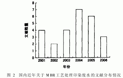 如上所述,在印染廢水的處理中,傳統方法總存在COD降低不完全、色度去除率低和處理成本高等問題,而MBR技術在理論上則有較強的針對性。國際上將MBR應用于處理印染廢水,開始于處理生活污水和市政污水之后,發展相對緩慢。在國內,該方面的研究也并不多[4],如圖2。