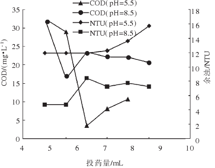 (1)從圖1可以看出,在pH值在5.5和8.5 時(shí),單用0.118 9 mol/L的陽(yáng)離子改性淀粉處理模擬廢水,堿性條件下的除濁效果優(yōu)于弱酸性條件. 在pH值為5.5時(shí),當(dāng)陽(yáng)離子改性淀粉投加量在5~ 8 mL時(shí),濁度處理是有效果的,其最佳投加量為 5 mL.在pH值為8.5時(shí),除濁的最佳投加量為6 mL. 但在最佳投加量處,堿性條件下的處理效果明顯優(yōu)于弱酸性環(huán)境.