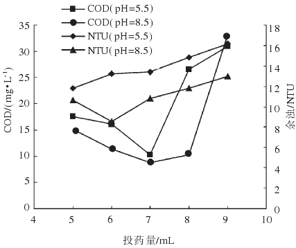由上面兩組數(shù)據(jù)的圖表明顯可以看出,不同 pH值對(duì)處理后的濁度效果偏差很大,而對(duì)于COD 的處理效果影響不是很大.