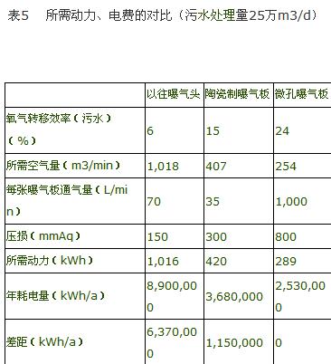 表5中列出了微孔曝氣板與以往曝氣頭和陶瓷制曝氣板動力及電費(fèi)消耗的對比情況。