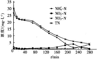 在典型周期內,短程同步硝化反硝化耦合除磷 過程中NH;一N、NO;一N、NO3-一N以及TN的變 化規律見圖3。 由圖3可知,在整個典型周期的反應過程中,亞 硝酸鹽氮和硝酸鹽氮始終保持在一個較低的濃度范 圍內。亞硝酸鹽氮濃度在初始曝氣時一直很低,經 3 h曝氣后,出現了小幅上升,隨后又逐漸降低;而 硝酸鹽氮濃度只在反應結束時出現了小幅上升。這 主要是由于氧擴散的限制,形成了DO濃度梯度,加 上體系內的DO濃度較低,氧氣無法深入到微生物 絮體內部,從而出現“表里不一”的現象,為硝化和 反硝化反應的進行分別提供了有利環境,實現了同 步硝化反硝化。由于微生物絮體外表面的DO濃度 較絮體內部的高而形成了好氧區,以硝化菌為主,發 生了硝化反應,而氧氣濃度較低使硝化反應又只能 停留在亞硝酸鹽階段,出現了短程硝化現象;絮體內 部則由于氧傳遞受阻及外部氧大量消耗而形成缺氧 區,反硝化菌占優勢,發生了反硝化反應,從而實現 了短程同步硝化反硝化。從圖3還可知,在典型周 期內,氨氮濃度隨運行時間的延長而降低,從反應初 始時的27.05 mg/L降至0.51 mg/L,去除率達到 98%。在反應初期,氨氮濃度有所下降,這是由稀釋 效應引起的。而總氮的降解曲線與氨氮的降解曲線 大致相同,這是因為進水氮源主要為氨氮,且在整個 反應過程中,由氨氮轉化的亞硝酸鹽氮與硝酸鹽氮 一直沒有得到較多積累,使總氮始終保持與氨氮同 樣的下降趨勢,由進水時的30.19 mg/L降至出水時 的3.95 mg/L,去除率達到87%。