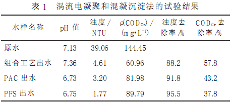 從表1可以看出,渦流電凝聚組合工藝對濁度和CODCr的去除效果均較好,去除效率能達到88.2%和57.8%,且出水ρ(CODCr)降低到60.96mg/L,濁度降低到4.61NTU,達到污水綜合排放標準GB8978-1996中的一級排放標準,而PAC和PFS雖然對濁度的去除效果好,但對CODCr的去除效果差,分別只有43.2%和37.8%。