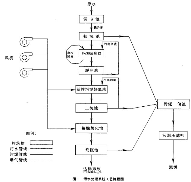 從上表不難看出上流式厭氧污泥床(UASB) 是比較優越的處理工藝,在較低的造價和能耗下不僅有較高的有機物容積負荷,而且有很高的處理效率。因此該廠選用上流式厭氧反應器作為工藝主體構筑物。其構造與其它厭氧生物處理裝置的不同之處是:1、廢水由下向上流過反應器;2、污泥無需特殊的攪拌設備;3、反應器頂部有特殊的氣、液、固三相分離器。整個廢水處理工藝采用 “UASB反應器+活性污泥曝氣池+接觸氧化池”的處理工藝。廢水處理工藝流程見圖1。
