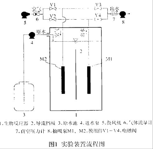 在該分離/ 曝氣微孔膜- 生物反應器中,兩組膜件以一定的運行周期交替充當過濾分離器和曝氣器。如圖1 所示,在第一周期內,電磁閥V1、V4 開啟,V2、V3 關閉,膜組件M1 與出水相通,充當過濾分離器;膜組件M2 與進氣相通,充當曝氣器,生物反應器內的活性污泥混合液被強制循環,在導流擋板的左側形成上升流,而在右側形成下降流。在第二周期內,電磁閥V1、V4 關閉,V2、V3 開啟,膜組件M2 與出水相通,充當過濾分離器;膜組件M1 與進氣相通,充當曝氣器,此時,在導流擋板的右側形成上升流,而在左側則形成下降流。在任一運行時刻,整個系統均處于好氧狀態,并且連續出水。試驗原水取自某學生宿舍樓的生活污水,活性污泥取自北京市北小河污水處理廠二沉池回流污泥。每一次試驗結束后,均采用次氯酸鈉溶液(活性氯含量約為萬分之一) 對膜組件進行化學清洗(浸泡時間約為12 小時) ,以清除膜污染,恢復并測其清水膜通量到試驗前的水平,如此方進行下一次試驗。