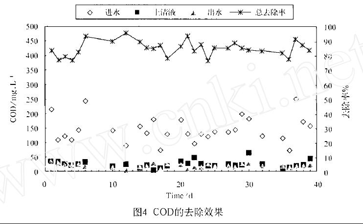 1) COD 去除效果:圖4 顯示的是在整個連續試驗中進水、上清液和PE - 4 膜組件出水的COD 以及整個系統對COD 的總去除率的變化情況。從進水COD 的變化來看,試驗用原水屬低強度的生活污水,COD平均值為146mg/ L 。上清液COD 較之進水有大幅下降,平均值為29mg/ L ,表明試驗階段活性污泥具有很高的生物降解性能。出水COD 相比上清液又有所下降,平均值為21mg/ L ,最大值為35. 8mg/ L ,表明微孔不但可以有效截留污泥顆粒及微生物,并且可以進一步強化生物反應器的COD 去除效果。整個系統對COD 的總去除率平均超過85 %。
