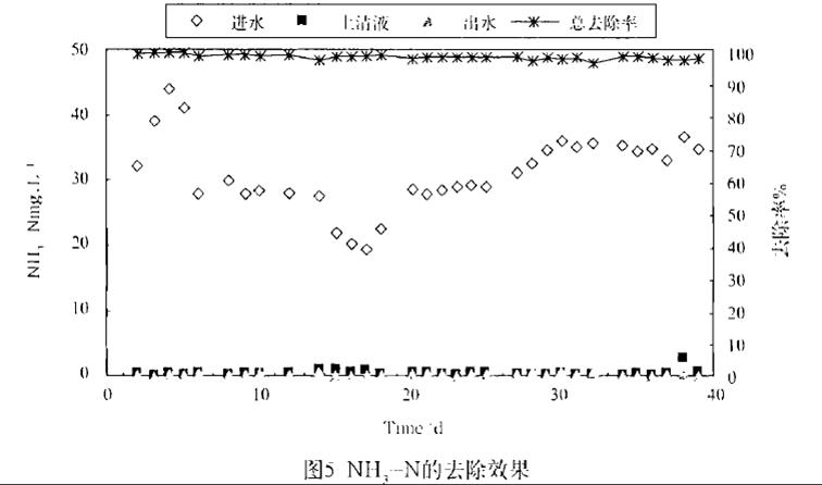 2) 氨去除效果:圖5 顯示的是在整個連續試驗中進水、上清液和PE - 4 膜組件出水的NH3 - N 以及整個系統對NH3 - N 的總去除率的變化情況。進水NH3 - N 在20~45mg/ L 之間,平均為32mg/ L。上清液NH3 - N 大多小于1mg/ L ,出水NH3 - N 始終未超過1mg/ L ,二者的平均值分別為0. 81mg/ L 和0. 53mg/ L ,表明試驗階段活性污泥具有很高的硝化能力。整個系統對NH3 - N 的總去除率平均超過98 %,同時可以查看中國污水處理工程網更多關于分離/ 曝氣微孔膜- 生物反應器處理廢水的技術文檔。
