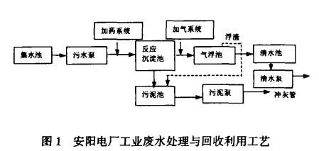 高效氣浮法此法采用SPD型高效氣浮裝置,利用其特殊的“零速度”原理:原水從氣浮池中心旋轉頭進入,通過配水器布水,配水器移動速度和進水的流速相同,方向相反,產生了“零速度”,這樣進水不會對原水產生擾動,使得顆粒的懸浮和沉降在一種靜態下進行。秦皇島熱電廠就是利用此法,對廠內工業廢水處理回收利用的,不再向原排污口新開河排放污水,減少了對渤海灣的污染,具有明顯的環境效益?傊,對于電廠含油廢水的乳化油,一般均采用氣浮法予以去除,除油效率較高。圖1為安陽電廠工業廢水處理與回收利用工藝…