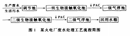 如圖1所示,電廠化學生產廢水、洗煤廢水、生活污水并進入調節池,廢水經過二級接觸氧化池的生物處理和氣浮池的混凝處理后,進入回用水箱。系統中采用生活污水的目的是利用其中的有機物質,充分發揮生物膜的接觸氧化作用。系統中氣浮池之前均需加入混凝劑(選用聚合鋁PAC),加藥點分別在二個氣浮池的人口。