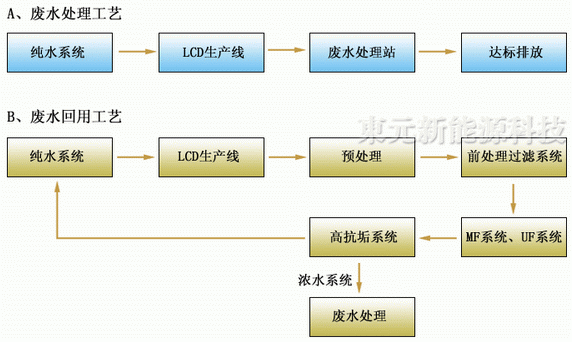 LCD制程清洗廢水回用前與回用后系統(tǒng)工藝流程示意圖如下: