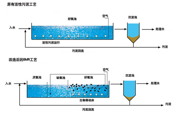 生物移動床是80年代末期出現的一種新型生物膜處理技術,吸收了傳統的流化床和生物接觸氧化法兩者的優點,成為一種高效的污水處理方法,BMR工藝則是在移動床基礎上結合AO、A2O工藝進一步優化改進,使其具有更高的處理效率。