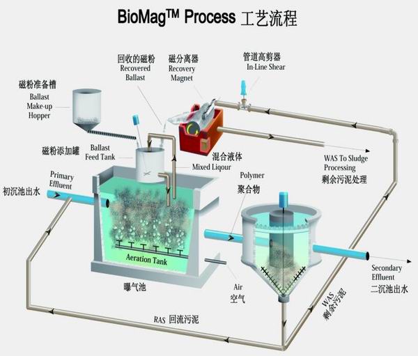 BioMag工藝是是繼CoMag工藝之后推出的一項通過向生物絮體添加磁粉來提高污水生化處理的工藝。經BioMag工藝處理過的水,其懸浮物、生化需氧量、氮和磷的濃度都比較低,且所需的占地面積相對常規生化系統較小。BioMag工藝可以大大減小生物反應器的容積,顯著降低去除BOD以及脫氮所需的占地面積。BioMag工藝的首要特點是,它在增加二沉池內的沉降速度和濃縮污泥層方面能力顯著。對需要更大處理能力或者需要提高有機污染物去除能力的活性污泥處理廠來說,BioMag工藝是理想的選擇。