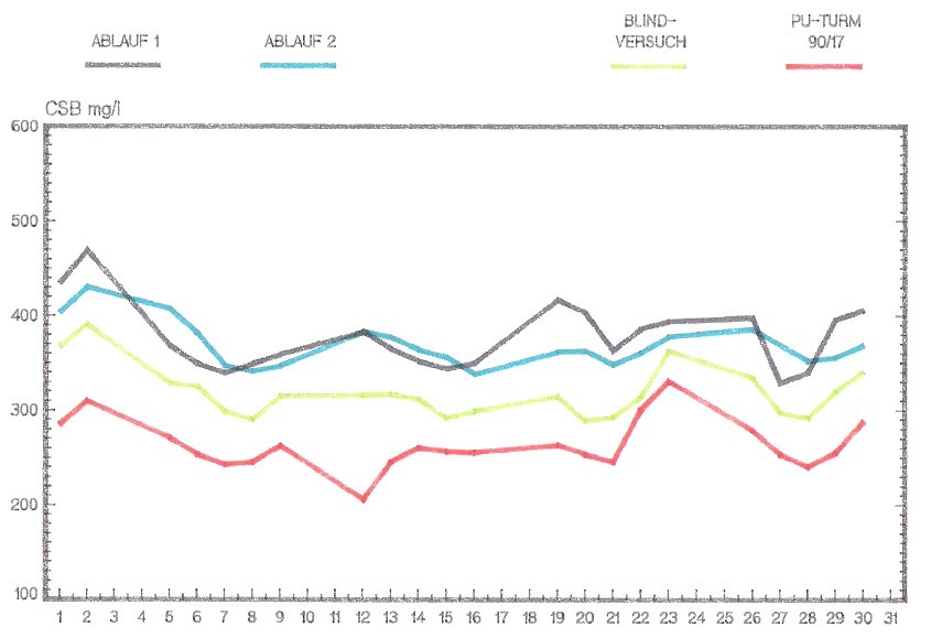 下面的兩張圖顯示的是一家化工廠的污水通過生物濾池的處理后COD 額外的去除率以及無LEVAPOR 和使用LEVAPOR 生物膜技術的對比。從中可明顯觀察到使用LEVAPOR 生物膜技術后COD 去除率更高,并且從