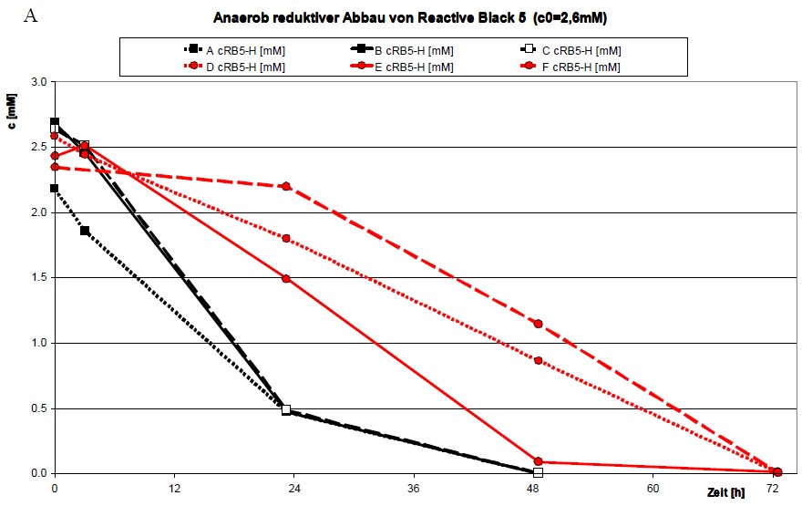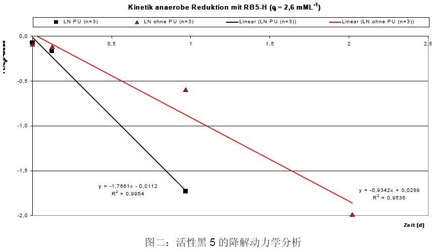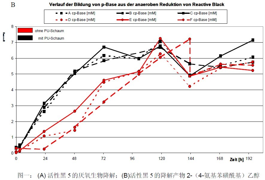 在該項目中對使用普通的活性污泥法和LEVPAOR 生物膜技術做了定量的分析。通過使用HPLC-DAD 檢測技術對染料物質活性黑5 的去除過程做了分析,見圖一。圖A 中是活性黑5 的濃度隨時間的變化情況。黑色曲線是使用LEVAPOR 生物膜技術,紅色曲線是使用活性污泥法的該偶氮類物質的濃度變化趨勢圖。從中可以觀察到使用LEVAPOR 生物膜技術48 小時后活性黑5 能徹底降解,而使用活性污泥法需要72 小時活性黑5 的濃度才趨近于零。