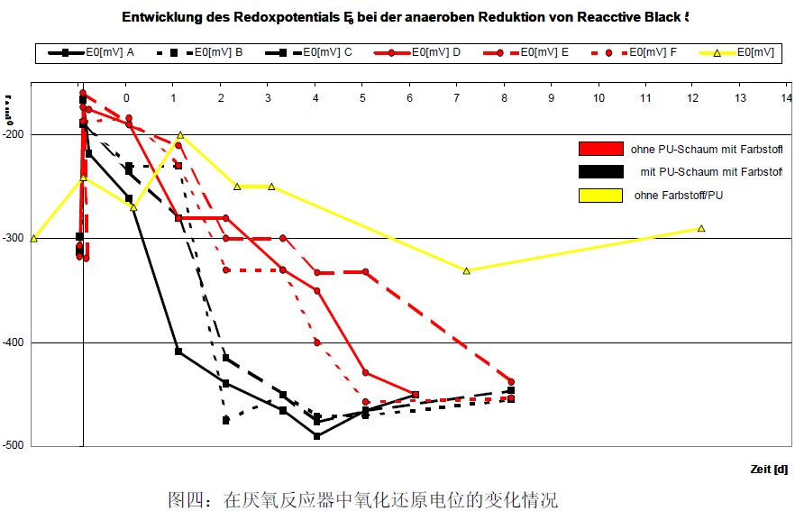 使用LEVPAOR 生物膜技術偶氮類物質的降解速度和氧化還原電位的減少速度更快表明其中存在一定的關聯。偶氮類物質的降解是因為偶氮基團被還原為氨基,從而電位降低。