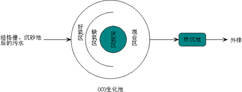 OCO工藝為在上述工藝的基礎上經多年的研究與實踐推出的。OCO工藝是一種A/O脫氮除磷工藝,污水先進入厭氧區(qū)(內圈),再進入缺氧區(qū)(中圈),然后進入好氧區(qū)(外圍),各圈均呈循環(huán)流態(tài),其顯著特點是缺氧區(qū)與好氧區(qū)有一半是合二為一的,它們之間的隔墻呈C字形,三圈隔墻的形狀就像OCO,由此命名。