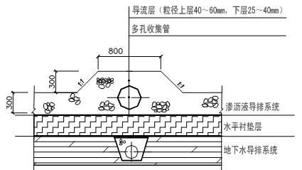收集溝設(shè)置于導(dǎo)流層的最低標(biāo)高處,并貫穿整個(gè)場(chǎng)底,斷面通常采用等腰梯形或菱形,鋪設(shè)于場(chǎng)底中軸線上的為主溝,在主溝上依間距30~50m設(shè)置支溝,支溝與主溝的夾角宜采用15的倍數(shù)(通常采用60),以利于將來(lái)滲濾液收集管的彎頭加工與安裝,同時(shí)在設(shè)計(jì)時(shí)應(yīng)當(dāng)盡量把收集管道設(shè)置成直管段,中間不要出現(xiàn)反彎折點(diǎn)。收集溝中填充卵石或碎石,粒徑按照上大下小形成反濾,一般上部卵石粒徑采用40~60mm,下部采用25~40mm。