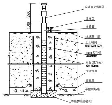 在填埋區(qū)按一定間距設(shè)立貫穿垃圾體的垂直立管,管底部通入導(dǎo)流層或通過(guò)短橫管與水平收集管相接,以形成垂直-水平立體收集系統(tǒng),通常這種立管同時(shí)也用于導(dǎo)出填埋氣體,稱為排滲導(dǎo)氣管。管材采用高密度聚乙烯穿孔花管,在外圍利用土工網(wǎng)格形成套管,并在套管上與多孔管之間填入建筑垃圾、卵石或碎石濾料,隨著垃圾層的升高,這種設(shè)施也逐級(jí)加高,直至最終封場(chǎng)高度,底部的垂直多孔管與導(dǎo)流層中的滲濾液收集管網(wǎng)相通,這樣垃圾堆體中的滲濾液可通過(guò)濾料和垂直多孔管流入底部的排滲管網(wǎng),提高了整個(gè)填埋場(chǎng)的排污能力。排滲導(dǎo)氣管的間距要考慮不影響填埋作業(yè)和有效導(dǎo)氣半徑的要求,一般按50m間距梅花形交錯(cuò)布置。排滲導(dǎo)氣管隨著垃圾層的增加而逐段增高,導(dǎo)氣管下部要求設(shè)立穩(wěn)定基礎(chǔ)。典型的排滲導(dǎo)氣管斷面見(jiàn)下圖。(藍(lán)白藍(lán)網(wǎng))