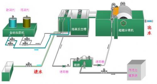 (3)經過混凝反應后,出水流入超磁分離設備,在高磁場強度下,形成的磁性微絮團由磁盤打撈出水中,實現微磁絮團與水體的分離,出水直接排放或回用;