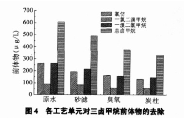 三鹵甲烷被認為是氯化形成的主要消毒副產物,我國2005 年實施的城市供水水質標準中規定三鹵甲烷的質量濃度不能超過0.1mg/L。飲用水中檢測到的三鹵甲烷類消毒副產物共有4 種,即氯仿、二氯一溴甲烷、一氯二溴甲烷和溴仿。研究表明,三鹵甲烷的各組分具有明顯的致突變作用,且存在良好的劑量反應。本工藝采用的是后加氯,氯化過程中產生的消毒副產物直接進入給水管網,因此要在給水處理過程中減少其前體物。三鹵甲烷生成勢是指在水樣中加入足夠量有效氯,反應足夠長時間生成的三鹵甲烷總量,可以用來描述能夠生成三鹵甲烷的那一部分有機物。由于原水中溴的含量很低,所以溴仿的量一直低于檢出限。由圖4 可知,常規工藝對三鹵甲烷前的其它各個組分都有一定的去除率,氯仿前體物為25%,一氯二溴甲烷前體物為9%,一溴二氯甲烷前體物為17%,總三鹵甲烷前體物為19%。經過臭氧單元,三鹵甲烷的各個前體物的總去除率達23%。生物活性炭對三鹵甲烷前體物的去除率只有11%。有學者認為:原因是粒狀活性炭對三鹵甲烷前體物的去除主要依靠吸附作用,而炭柱內的活性炭運行一段時間后吸附能力明顯降低。同時,藻類、有機物等的累積對去除三鹵甲烷的前體物也有負面影響。